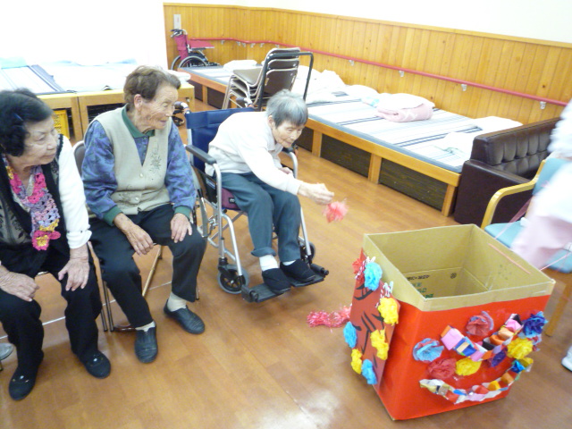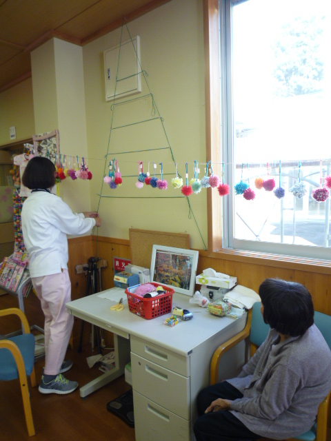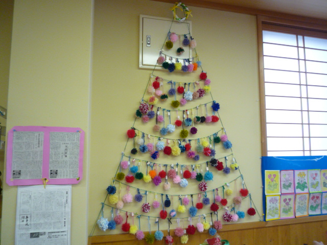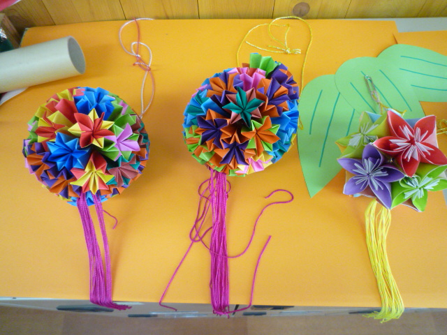 毛糸を使ったボンボンや塗り絵折り紙で出来たくす玉を