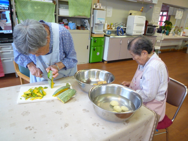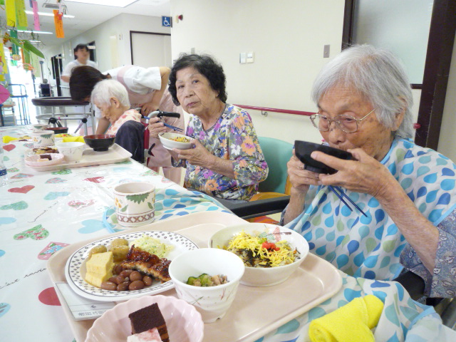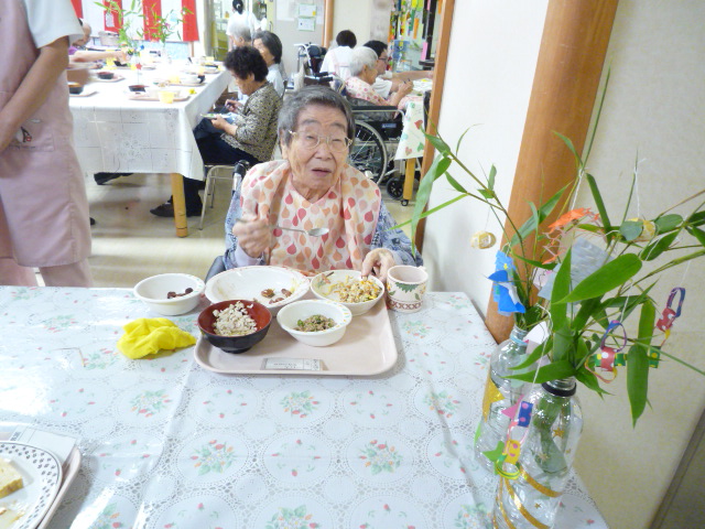 いつもはデイルームでお昼ご飯をいただくのですが、七夕模擬店を実施したこの日はデイの隣にある施設の食堂でご飯を頂きました。いつもと違った雰囲気とバイキング形式のご飯を味わって頂き、皆さん喜ばれておりました。