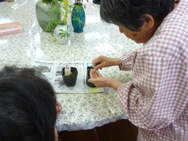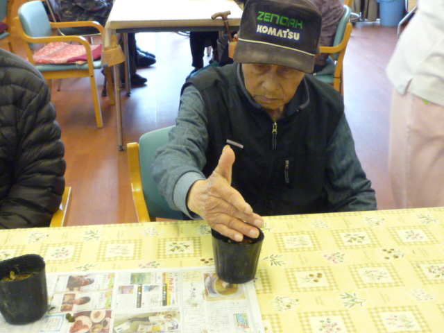利用者様に手伝って頂きカボチャ、ひまわり、百日草、なでしこ、アサガオの種を蒔きました。