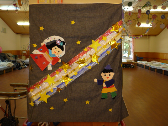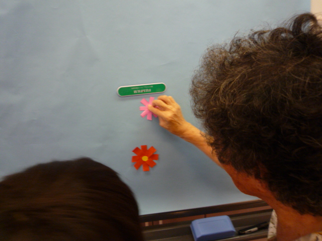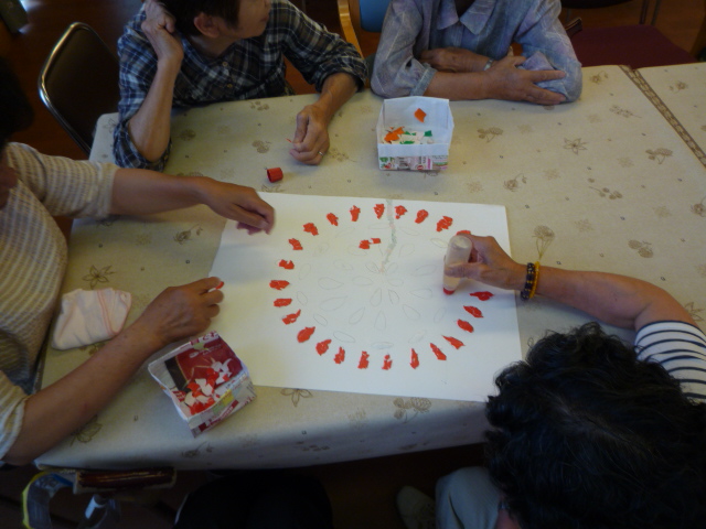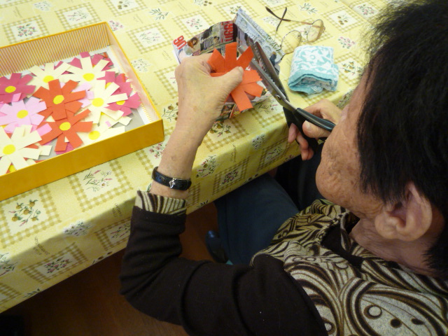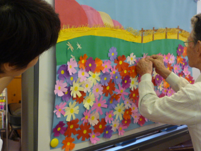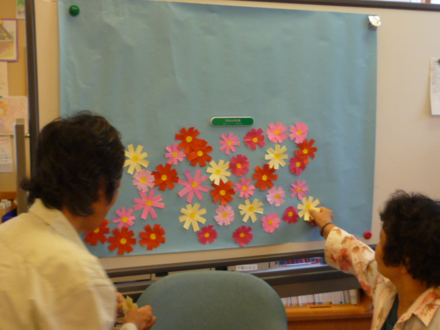 10月の壁画に使用するコスモスを作業中です。コスモスは色紙で作りました。