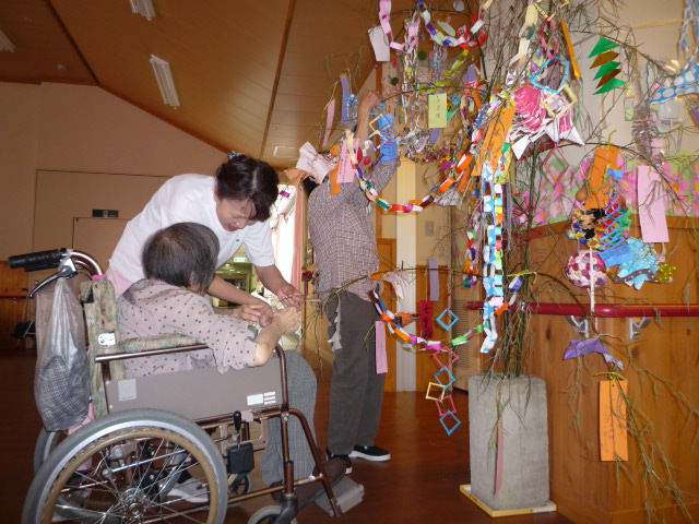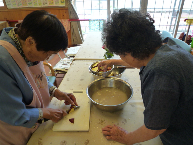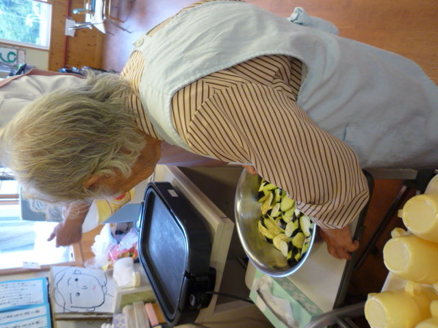 菜園で収穫した野菜を利用者の皆様に食べて頂きました。野菜を切ったり、焼く作業を手伝って頂きました。