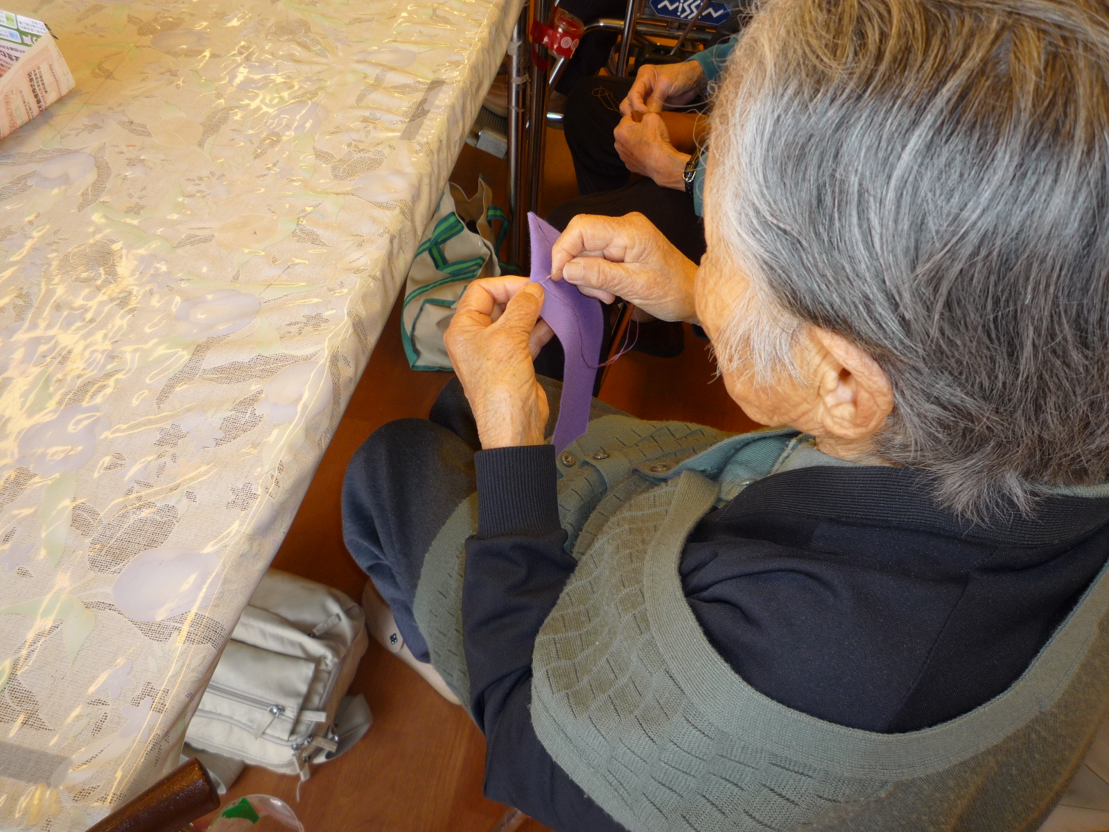 針で指を刺してしまう職員、すいすいと縫っていく利用者、みなさん