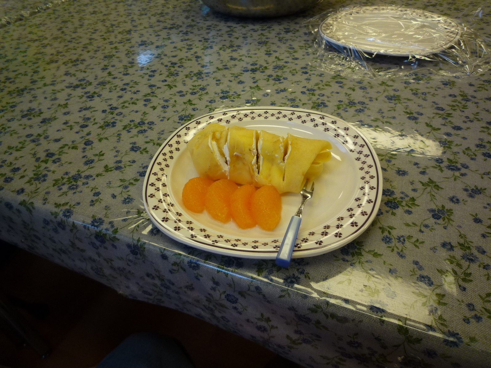 ホットプレートで焼いたクレープ生地に、バナナ、みかん缶、生クリームを