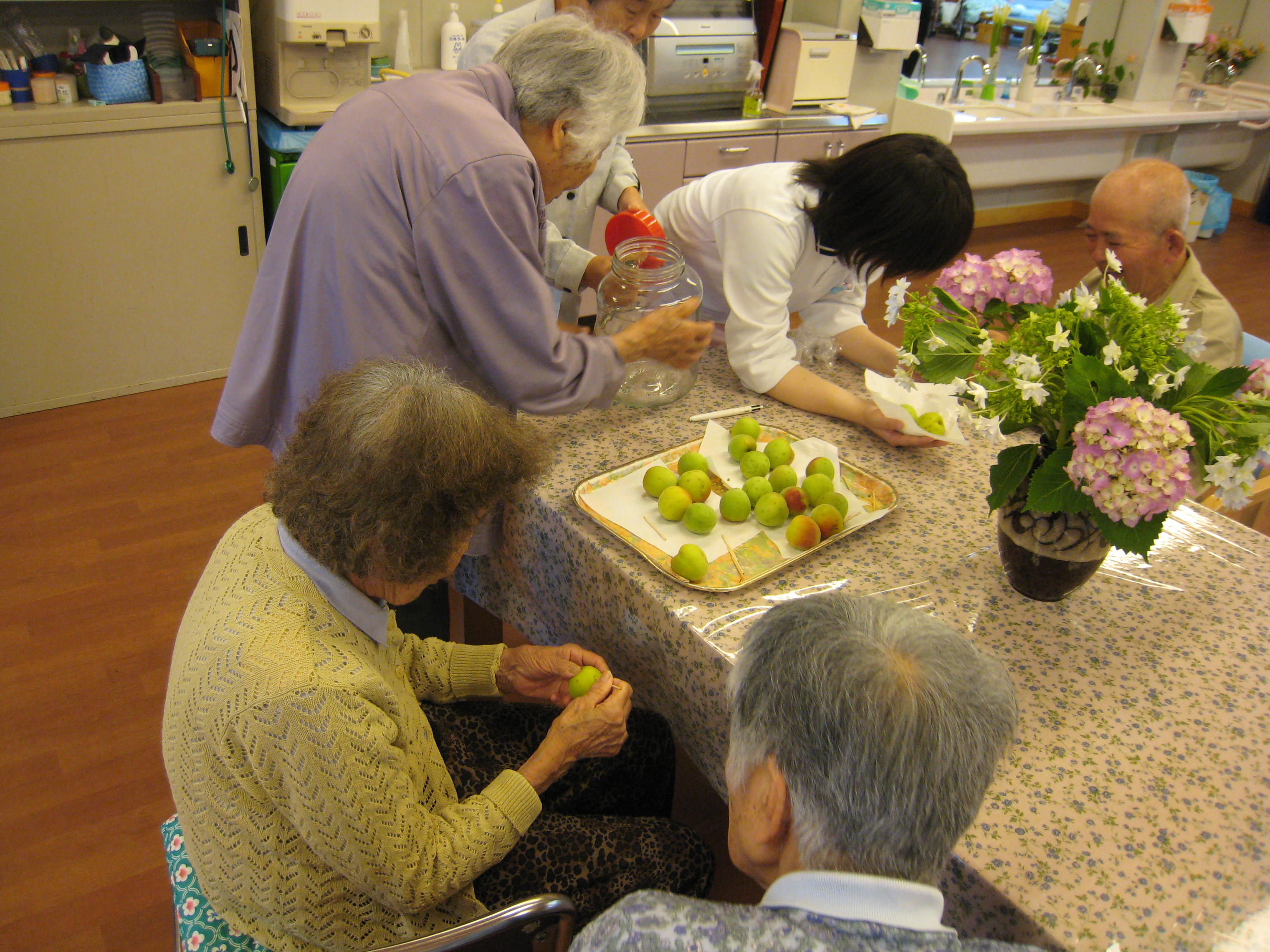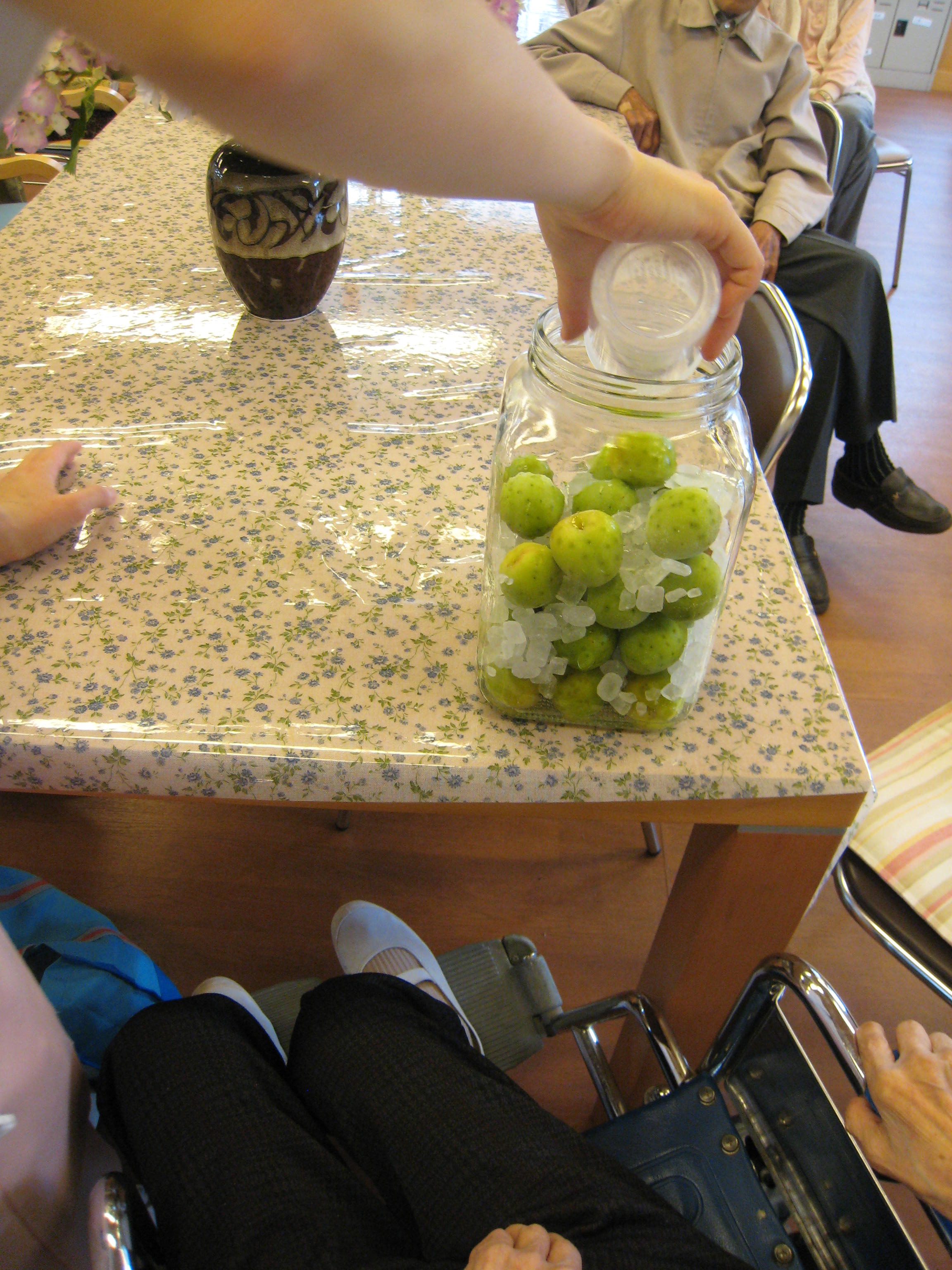 各曜日ごとに瓶を用意し、利用者様に梅に爪楊枝で穴をあけて頂きました。
