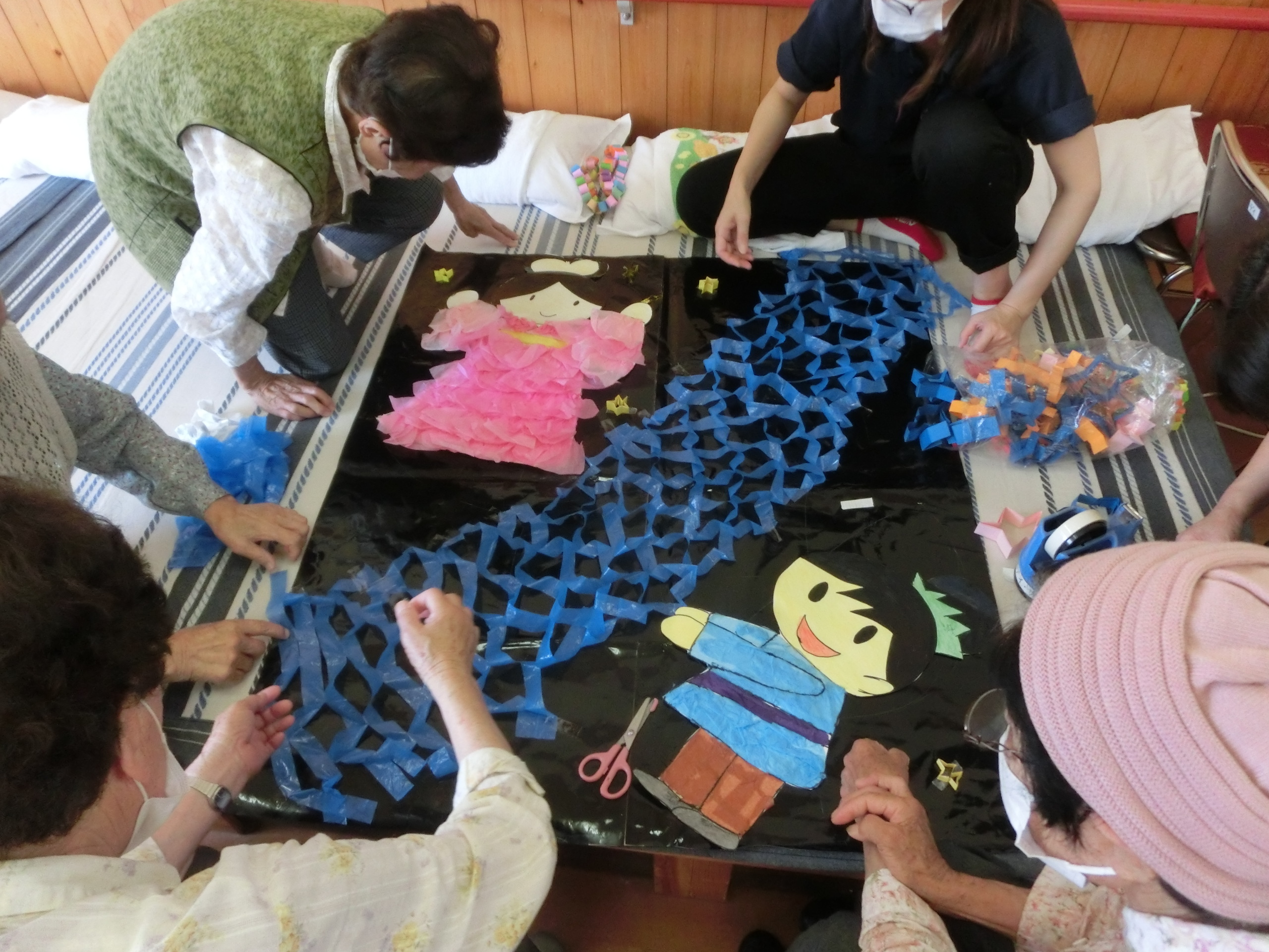 今月のクラフトは七夕飾り作りと折り紙をつかって花火を制作しました
