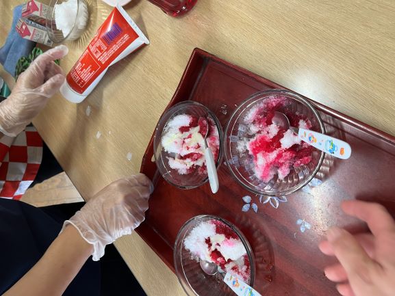 イチゴ、レモン、メロンと利用者さんが好きなシロップでトッピングされていました。頭キーンとなり、おいしいと喜ばれていました。(*^-^*)