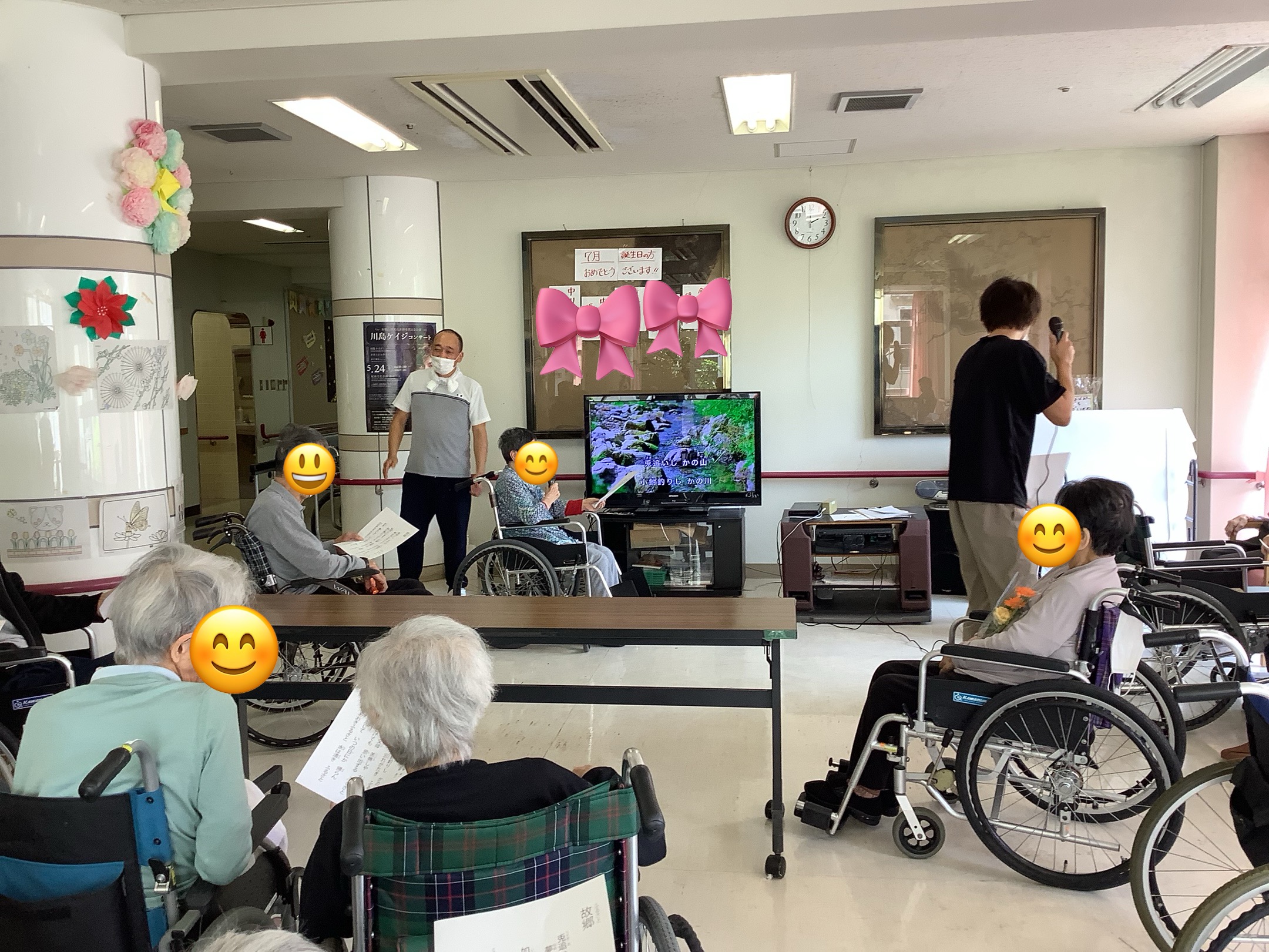 お誕生日会の後は夕涼み会で風船送り🎈やカラオケを楽しんでおられました。