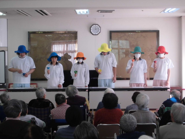 こどもたちの歌と踊りのあとは職員によるハンドベルの演奏、音を外すことも