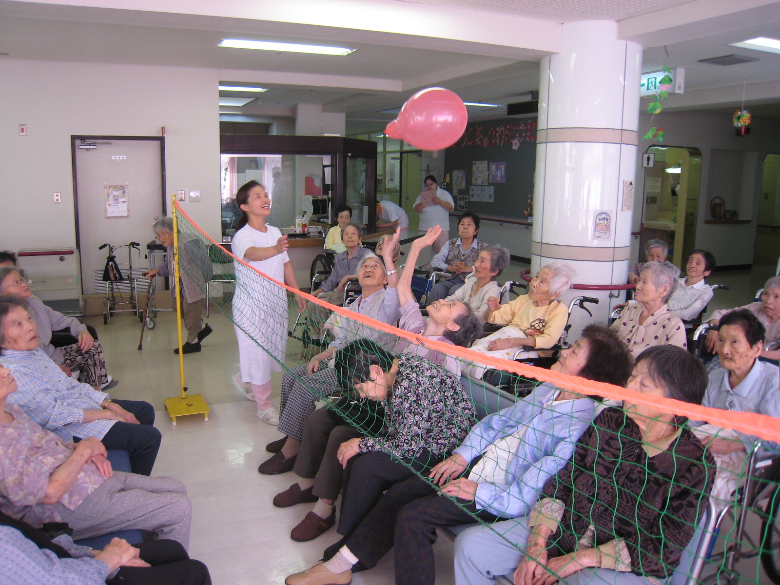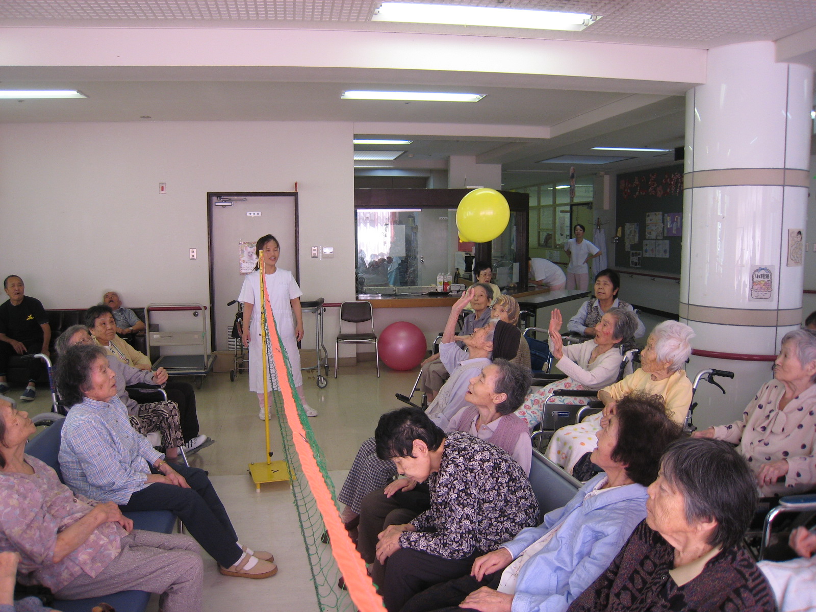 午前中は利用者さんと一緒に体操されたり、午後はレクリエーションと清掃活動を