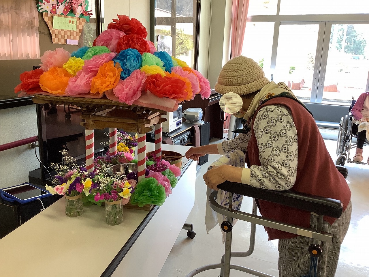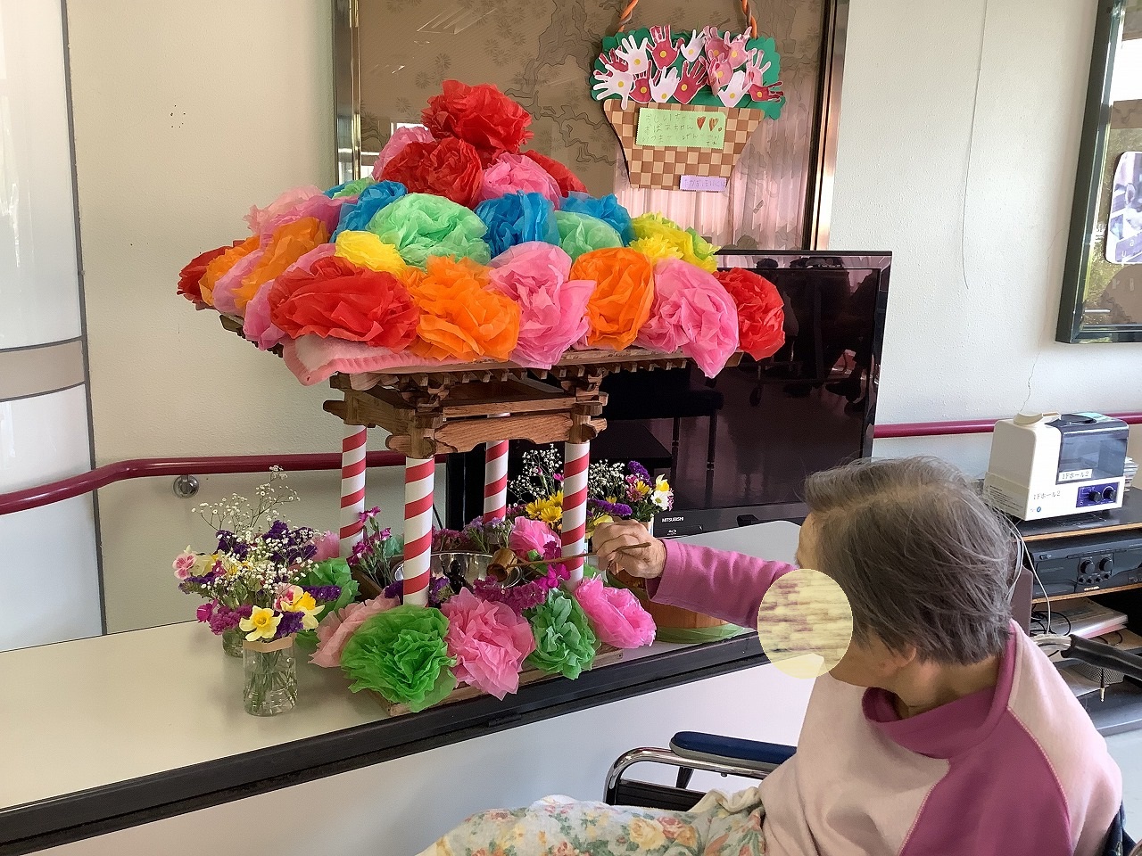 1Fホールにて花祭りの由来の説明をして利用者さんにお釈迦様に甘茶をかけてもらいました。