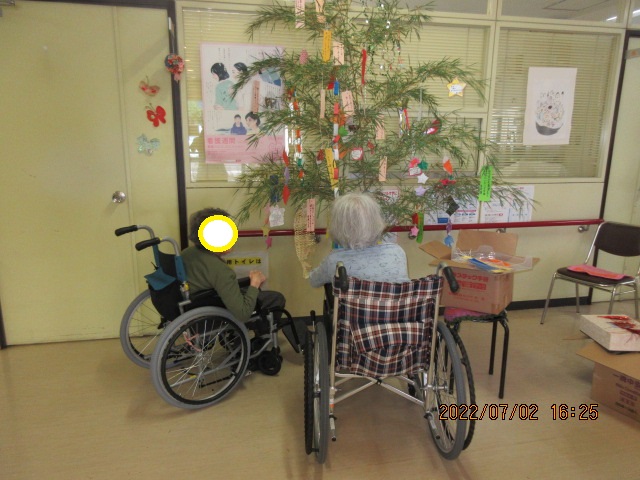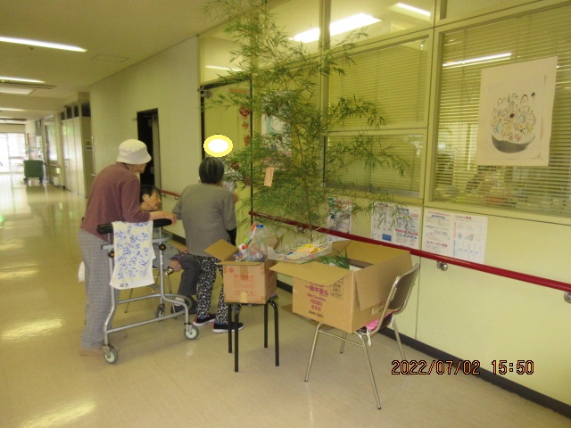 7/7の七夕祭りの願い事を書いてもらい利用者様と一緒に笹に飾り付けをしました。皆さん願いをこめて飾り付けをされていました。